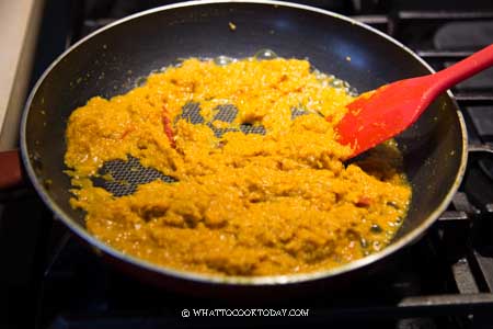- Pour the spice paste into a large skillet or wok and stir fry until really fragrant. Remove 1/2 of the paste to marinate chicken and leave the other half in the skillet
