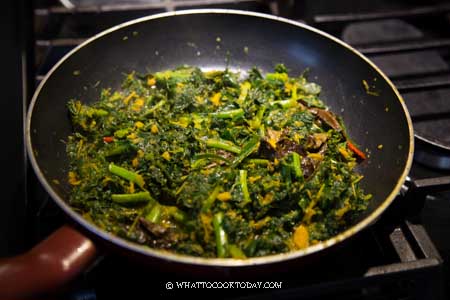 - Add the kale or cassava leaves into the skillet and cook until they are partly wilted. Turn off the heat. Have a taste and season with more salt if needed