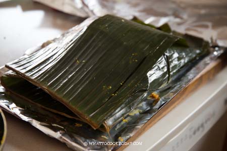 - Rub the remaining spice paste all over the chicken. Rinse the banana leaves with clean water and then wipe it dry. Place one large piece of aluminum foil on the countertop, 2 times bigger than the size of the chicken. Place one large piece of banana leaf on top of the aluminum foil, slightly bigger than the chicken and put another 2 large pieces of banana leaves on top, kinda overlapping to cover the chicken. Cover with another oversized aluminum foil and wrap the chicken with the foil. This will also help to secure the banana leaves in there. Place this in the refrigerator and let it marinate overnight. Remove from the fridge and let it sit on the counter for 30 minutes before you plan to cook