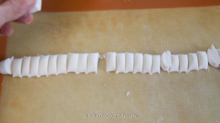 2. Roll into a long log and then cut into about 36-40 pieces. Roll into round dough balls. Keep them covered with a damp cloth. If the dough gets dry, dab with a bit of water and roll.