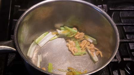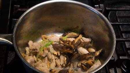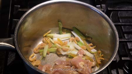- Preheat a large pot on medium-high heat. Add the cooking oil. Add the white part of green onion and ginger. Saute for about 1 minute. Add the dried shrimp and shiitae mushrooms. Saute for another minute. Add the chicken pieces and saute until they just turn color