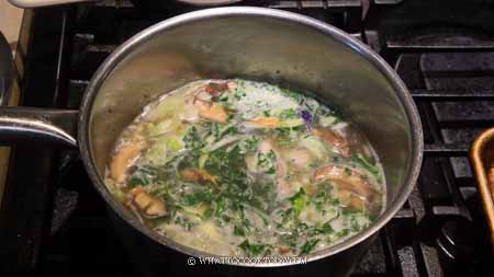 8. Portion the glutinous rice balls in the bowl. Generously ladle the hot soup over with some chicken and veggies. Garnish with some green parts of green onion and serve warm