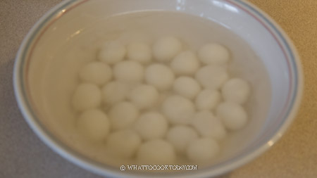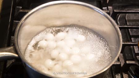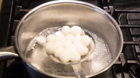 - Bring a large pot of water to a boil. When they are rolling boil, add in the glutinous balls and let them cook until they float to the top and let them cook for another minute. Use a slotted spoon to remove them and submerge them in cold/room temperature water briefly to prevent them from sticking to each other