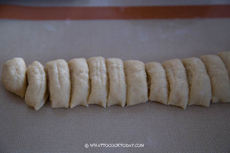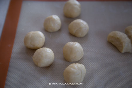 - After 15 minutes, roll the dough into a long log and roll it smoother and then cut into 16 equal pieces of dough. Roll them into round balls. Keep them covered with a damp towel or plastic wrap. Work with one at a time