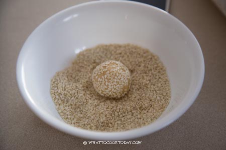 - Prepare a cup of water. Wet your fingers and slightly wet each ball and then roll in sesame seeds to cover all the surface of the balls. Repeat with the rest