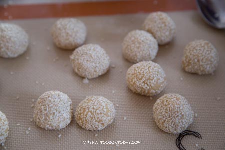 2. After rolling the balls into sesame seeds, I brushed with some oil