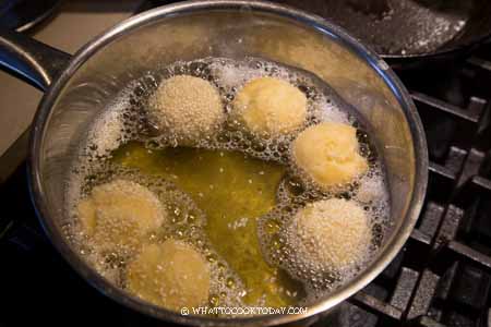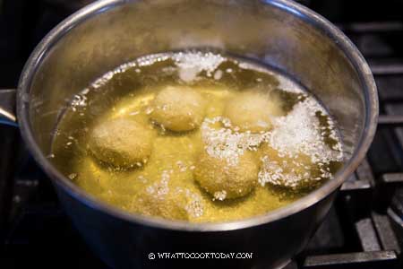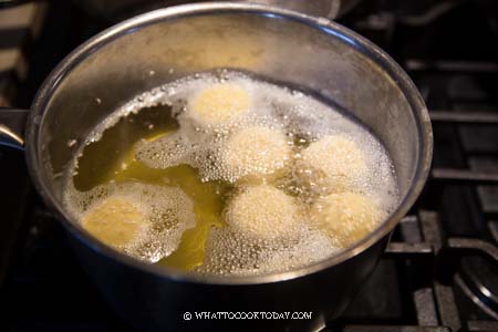 Preheat about 2 inches of oil. The temperature of the oil is important when it comes to frying these smiling balls. If the oil is too hot, the balls won’t crack open and smile. Oil should be maintained at 285 F (140 C), which is about between medium and low heat. Fry about 5-6 balls at a time. The balls will sink to the bottom of the oil at first and there won’t be any bubbles around them yet.
