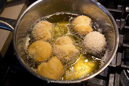 These cute smiling sesame balls are popular Chinese New Year snacks. They are slightly sweet, crisp on the outside like a cookie, and soft inside like a cake. All the tips you need to make sure the balls crack open and smile at you.