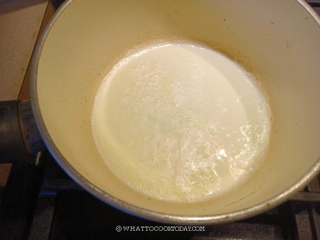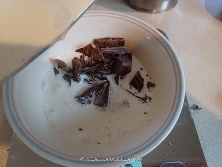 7. While the cake is baking, we can prepare the chocolate mascarpone cream. Heat the heavy cream until it comes to just gentle simmer and turn off the heat. Pour this over the chocolate and let it sits for about 10 seconds and then stir. The chocolate will melt as you stir