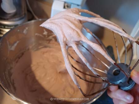 13. Whisk the chilled chocolate heavy cream mixture and icing sugar over medium speed until it just started to thicken. It is important not to overbeat. Add the mascarpone cream and continue beating until the cream is medium-firm. It can hold its shape but not stiff. If you overbeat, the cream will turn grainy and worse, it may separate