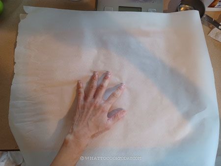 10. After 5-6 minutes. Place a new piece of parchment paper, larger than the cake, on top of the cake and flip over to the other side. Peel off the parchment paper
