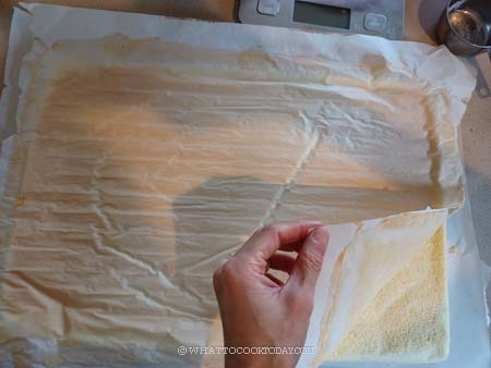 - Remove the cake from the oven and then lift it out from the pan immediately to a cooling rack and peel off the parchment paper from 4 sides. Let it cools down like this for 5-6 minutes