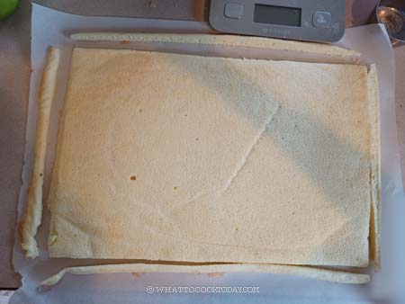 9. Remove the cake from the oven and then lift it out from the pan immediately to a cooling rack and peel off the parchment paper from 4 sides. Let it cools down like this for 5-6 minutes