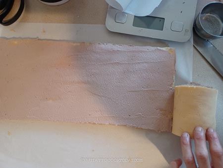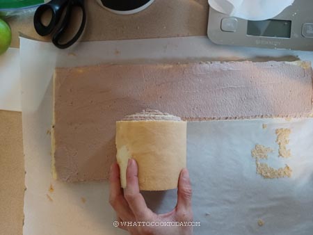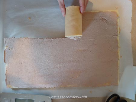 - Brush the simple syrup all over the cake with a pastry brush. Apply the cream to the surface of the cake. Starting from the first roll, roll up and then "connect" it to the second sheet and continue to roll and then "connect" to the 3rd one. It may get a bit difficult as the roll will get bigger. If the rolls break, don't worry, just do your best to continue rolling. The broken piece will not show on your final design