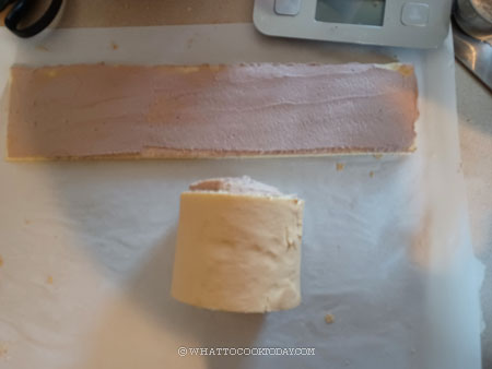 A vertical layer cake is basically just like a roll cake/Swiss roll cake. You roll the cake on its long side and then stand the cake up vertically and continue to add on several layers, depending on how large you want the diameter to be. When you cut into the cake, instead of seeing the traditional horizontal layers, you will see vertical layers instead, which is kinda exciting to most people (or probably just me LOL!)