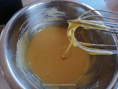 4. Gently fold 1/3 of the meringue into the thick batter. Using a whisk, using a cutting motion and fold over to mix. Repeat this motion several rounds. Continue on with the second 1/3 of the meringue again to mix. For the last 1/3 of the meringue, use a rubber spatula instead to ensure you get all the batter at the bottom of the bowl mixed in as well. Use a cut down in the middle and fold over motion to fold gently but quickly. Make sure you don’t see any more white meringue. The mixture should be fluffy and voluminous