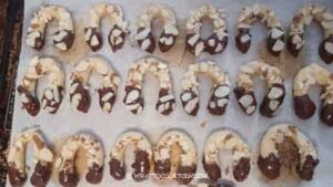 - Dip the two ends of the almond horns halfway into the melted chocolate and place on a baking pan lined with parchment paper and let the chocolate set.