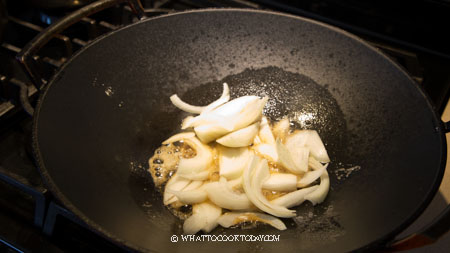 6. Add onion, garlic, and ginger. Stir fry until the onion has turned soft and translucent, about 5 minutes or so