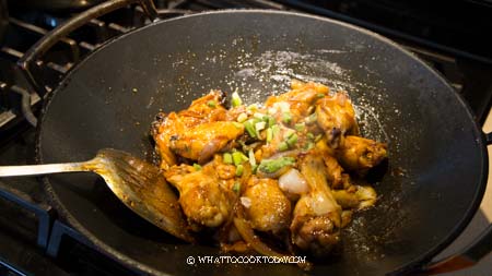 7. Add the baked/fried chicken pieces followed by seasonings. Stir to mix to make sure the sauce is coating the chicken pieces evenly. Have a taste. It should be more on the sweet side. Add more kecap manis if needed