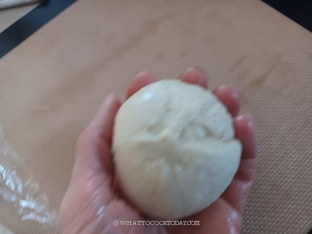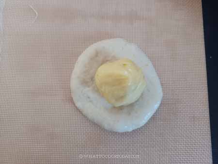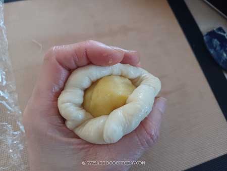 9. To wrap the filling inside the dough with a firm custard, flatten one dough and roll into about 4-5-inch circle. Place one filling ball in the middle. Gather the edge of the dough to enclose and pinch to seal the bun. Place the seam side down on a baking pan lined with parchment paper and repeat with the rest of the dough. Cover with plastic wrap or a clean kitchen towel and proceed to 2nd proofing
