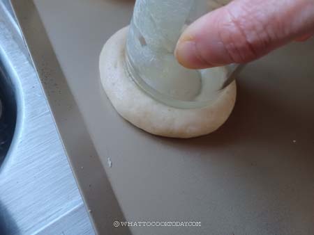 7. To top custard on top of the dough, take one dough and flatten with your palm to about 3-4 inch round. Dip a base of a round cup in a flour to prevent sticking and press the base of the cup on the dough to create a “crater” for you to pipe the custard filling