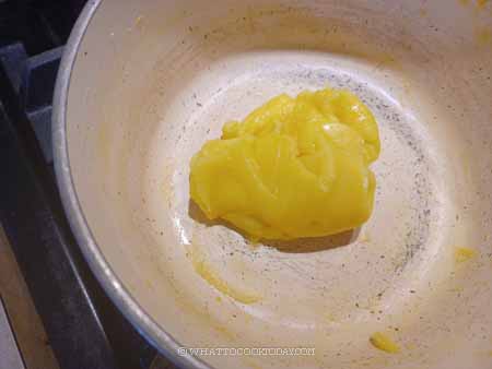 - Put the saucepan over low heat. Add butter and continue to stir until butter started to melt and continue to cook. For firm custard, cook until the custard thickened to a thick paste consistency. For the soft custard, cook until when you lift the whisk, it hangs down as a V shape but will drop down. Remove from the heat. Cover with a cling wrap touching the custard to prevent a layer of skin from forming. Chill in the fridge until it's firm for at least 30 minutes
