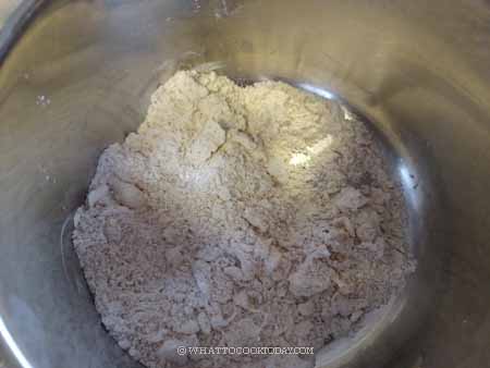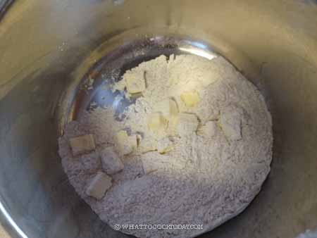 1. Combine all the dry ingredients in a mixing bowl and set aside. Cut the butter into small cubes or alternatively, you can use a grater to grate the butter. Add the butter to the dry ingredients and rub them to get an unevenly crumbly mixture that is about pea-size