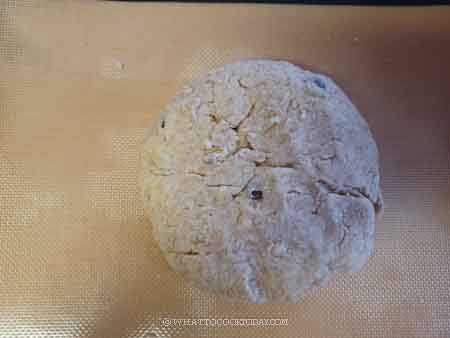 3. The dough is still crumbly. Give it a few knead just until the dough comes together into a rustic looking dough. If it’s too sticky, dust with a bit more flour. Line a large baking sheet with parchment paper. Shape the dough into roughly about 6-inch disc, about 1 inch thick