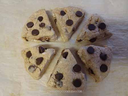 - I use a serrated knife to cut into 6 wedges. Arrange the wedges on the baking sheet, about 1/2 inch apart. You can gently push few more chocolate chips on top for decoration if you want
