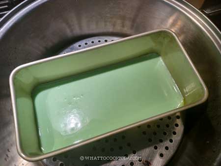 - Give the batter a good stir. Pour about 100 g of the pandan batter (or mung bean batter) into the pan. It's up to you which one you want to do first.