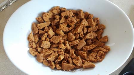 3. Then crush another 50 grams of Biscoff cookies into smaller pieces. It’s nice to bite into tiny pieces of Biscoff in the cake. You can skip this if you don’t want to. Set aside