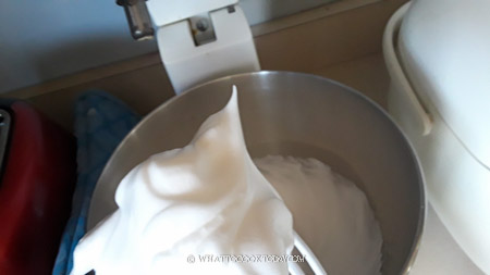 6. Beat the egg whites on medium speed until frothy, add vinegar and whip until it turns whitish and air bubbles are fine. Gradually add the sugar as you beat, in 3 batches. I beat them at medium speed (speed 6 on Kitchen Aid). This will take a bit longer compared to beating at high speed. I used to do higher speed (speed 8), but the meringue is smoother, more stable and nicer when I maintain the speed on 6. I highly recommend stopping several times to check on the consistency and scraping the sides of the bowl to make sure no sugar left on the side of the bowl. Whip until you reach a stiff peak but still have a slight bent on the tip. Then lower the speed to 4 and whip for 1 minute to even out large bubbles and stop beating
