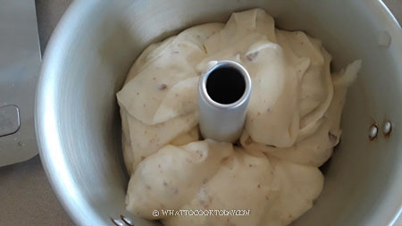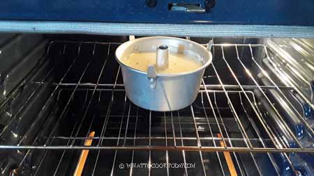 11. Once out of the oven, drop the cake pan from about 10 cm height on the counter several times to prevent shrinkage. Then carefully invert the pan upside down immediately. Your chiffon pan may have little stands for you to invert. Please don’t be tempted to remove it from the pan if it’s still warm. It takes about one to two hours to cool down completely