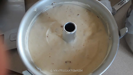 - Pour the batter into an UNGREASED chiffon cake pan. Use a rubber spatula to smooth the surface. Gently drop the cake pan from about 10 cm height on the counter 2-3 times. Use a skewer to draw a zig zag to pop bubbles inside the cake batter.