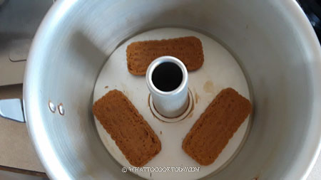 1. Arrange a few pieces of Biscoff cookies inside the tube pan. I only put three, I should have put maybe 4 or 5, but again it may be hard to fit that many in a pan. You can arrange it any way you want it. This will be the top of the cake later when you invert the pan