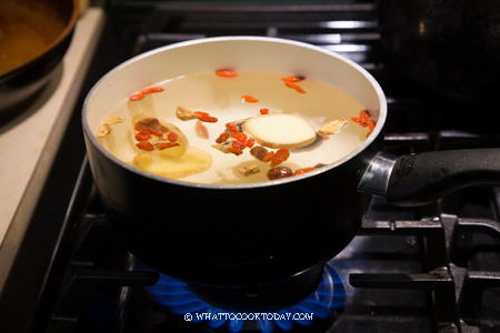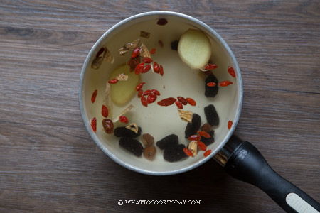 1. PREPARE THE INGREDIENTS: Wash all the dried Chinese herb ingredients. Thinly slice the ginger as it helps to release more flavor. When you buy the Dang Shen from the Chinese Medical Hall, ask them to cut the root into 1-inch pieces if possible