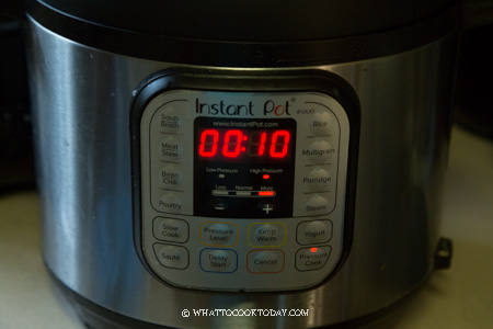 - Pour 1 1/2 litre of water into inner pot of Instant Pot. Add all the ingredients. Cover the lid. Turn the steam release valve to "sealing". Press "pressure cooker" and make sure it's on "high pressure". Set the timer to 10 minutes. Wait 5 minutes and then release pressure