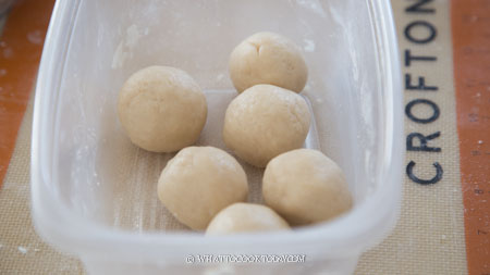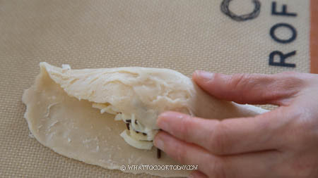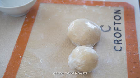 - Get one water dough and flatten into about 3 inch round circle. Place the oil dough on top and wrap the water dough around it. Repeat with the rest of the water and oil dough. Keep them covered and rest again for 15 minutes. Please don't skip this resting step