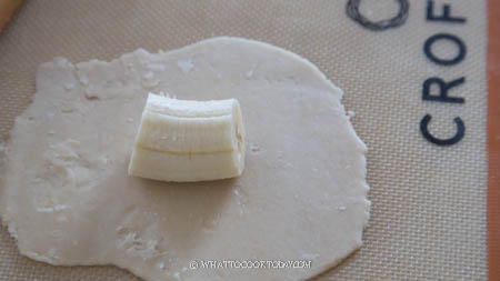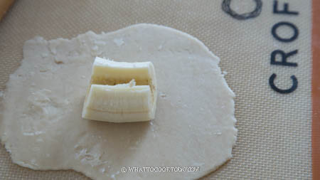 9. I use Cavendish bananas. Use the ones that have ripened but not too mushy. If the bananas are large, you can cut into 3 or 4 pieces to get 12 pieces. If you use raja bananas, which are much smaller than Cavendish bananas, then you may need 5-6 to get 12 pieces. Place one piece of banana in the middle of the flattened dough. Split the banana pieces halfway, don’t cut through it