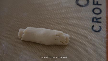 - Lightly dust your working surface with a bit of flour. Get the one dough and use a rolling pin to roll this dough into a flat oval shape. Roll it up tightly starting from the bottom like a Swiss roll