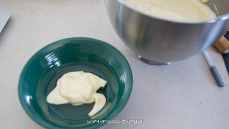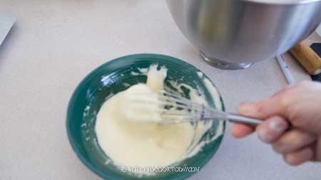 6. Once you no longer see any loose flour in the batter, scoop out about 1/3 cup of the batter into a different bowl. Add melted butter and stir to combine thoroughly using a whisk.