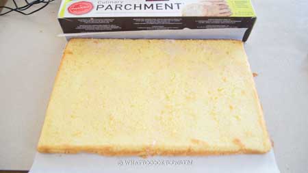 - Immediately when the cake is out of the oven, use an offset spatula to loosen the four edges of the cake. Put a large piece of parchment paper on top. Flip over to the other side and peel off the parchment paper. The cake should be soft. If there is a crust on the edge, trim those off so you won't have a problem rolling the cake