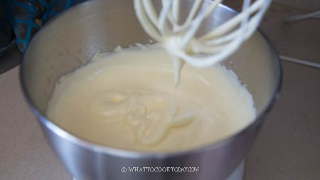 4. Beat on medium speed (speed 4 on KA) for 1 minute using a whisk attachment and then increase to high speed (speed 8). Beat until the mixture is thick, creamy, and pale. When you lift the batter with the whisk, the batter that drops down will leave a trail that remains visible for about a minute before slowly disappearing. You have to beat it to this ribbon stage or the cake will not turn out right