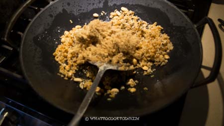 1. Put all ingredients for sugar syrup in a large skillet or wok. Stir until the maltose dissolves and then turn on the heat and bring the mixture to a boil, then lower the heat to low-medium to let it simmer until the mixture is bubbly and thickened