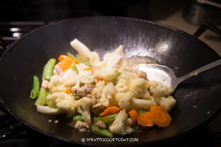 3. Add vegetables except for tomato wedges. Cook for about 5 minutes.