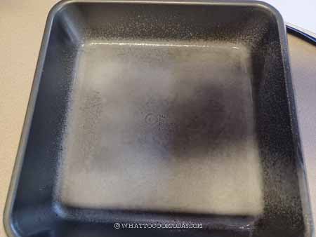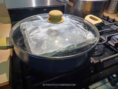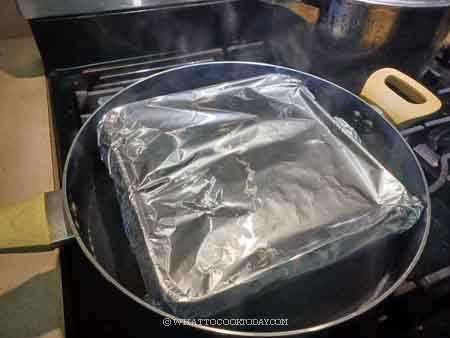 1. Bring the water in a steamer to a boil. Wrap the lid with a cloth to prevent water condensation drips on the cake. if your steamer lid is too close to the pan and you can’t wrap a cloth without touching the pan, cover the pan with aluminum foil later after you pour the batter in.
