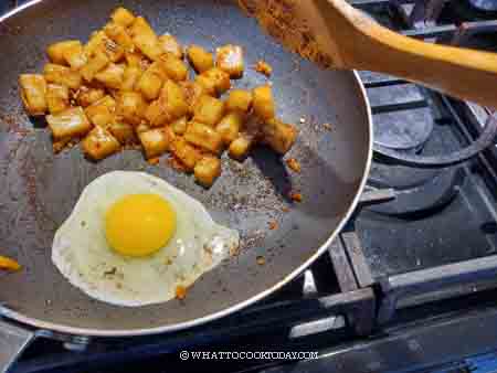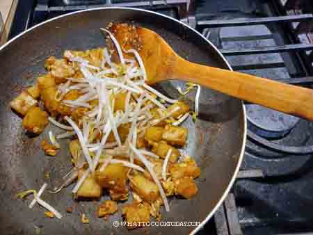 - Push the rice cake to the side. Add minced garlic ,chye poh, chili paste and stir fry for about 1 minute. Mix this around with the seared rice cubes. Push the rice mixture to the side again. Add the rest of the oil and crack in the eggs and let them cook for about 10 seconds undisturbed. When you see the eggs start to solidify at the bottom, stir to scramble the eggs. Add seasonings and stir to mix with the rice cakes. Add the sprouts and chives and stir fry for another 10-15 seconds or until the sprouts are heated through but still crunchy and not wilted
