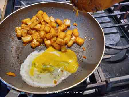 4. Mix this around with the seared rice cubes. Push the rice mixture to the side again. Add the rest of the oil and crack in the eggs and let them cook for about 10 seconds undisturbed