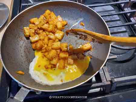 5. When you see the eggs start to solidify at the bottom, stir to scramble the eggs. Add seasonings and stir to mix with the rice cakes.