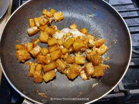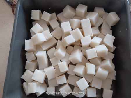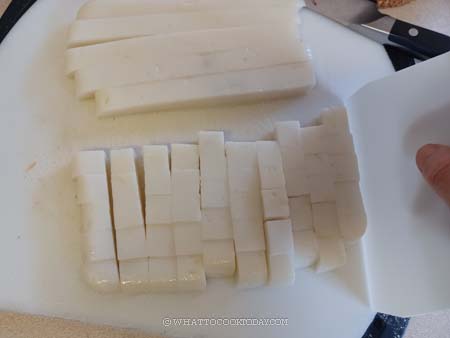 1. Cut the rice cake using a plastic bench scraper, plastic knife or an oiled knife to prevent sticking. Cut into about 1-inch cube. You can cut it bigger or smaller. It’s up to you